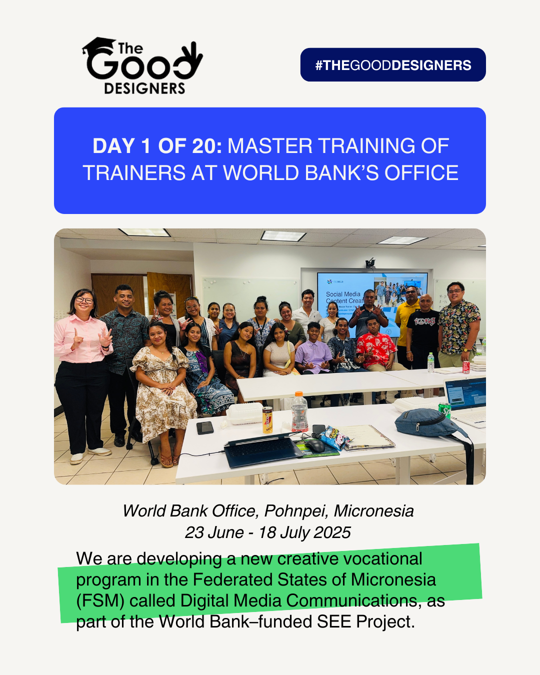 Beyond training and consulting, from Feb 2025 to Mar 2027, I dedicate several months each year as a Creative Industry Consultant and Curriculum Developer for the SEE Project, a World Bank initiative in the Federated States of Micronesia, where I design digital skills programs to uplift local high school and communities through creative vocational education.